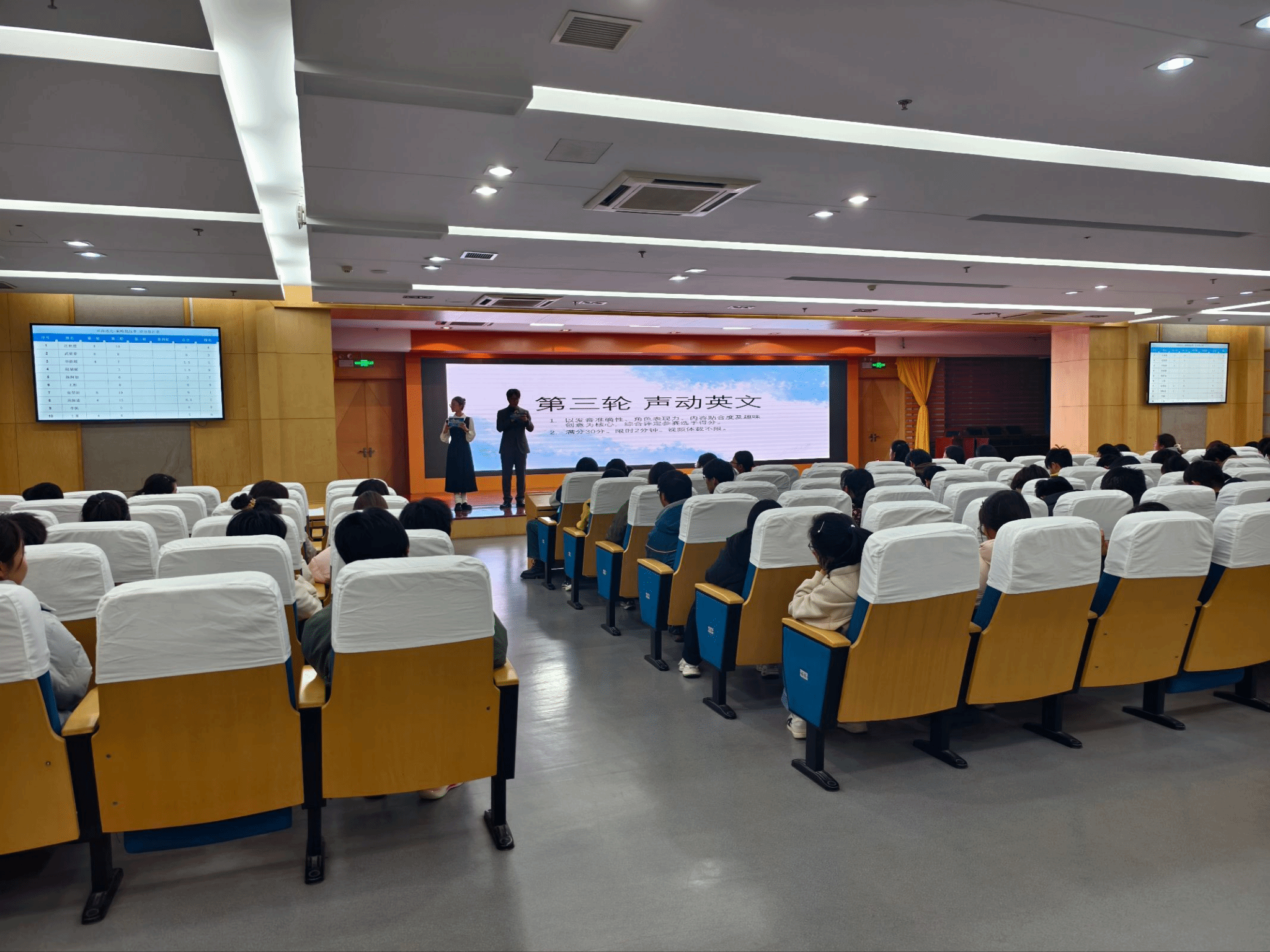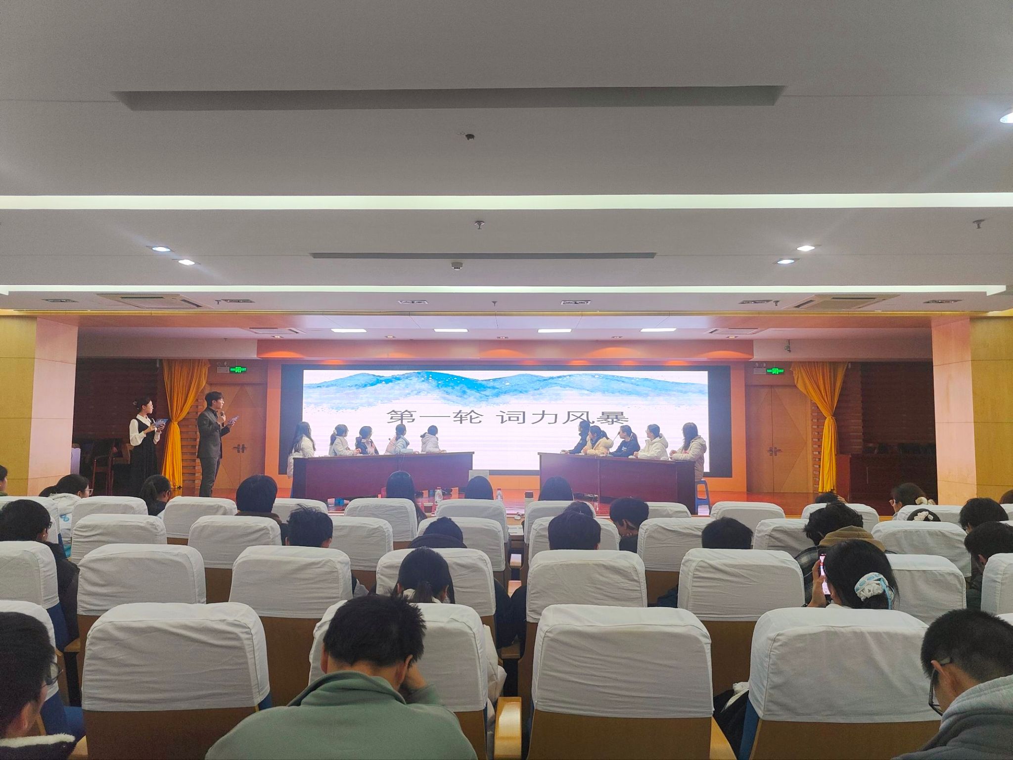 初赛现场 多轮比拼,各展风采。决赛采用积分制形式,设“词力风暴”“单词九宫格”“声动英文”和“英辩风采”四个环节,难度逐步提升。“词力风暴”抢答医学英语术语,检验词汇储备;“单词九宫格”以字母矩阵拼词,兼顾词汇量与思维灵活度;“声动英文”考察英语表达与表现力,“英辩风采”通过1分钟即兴演讲考验临场应变。选手们沉着应答、尽显功底,现场精彩纷呈。比赛还设置互动环节,10张趣味图片亮相,观众抢答赢礼品,氛围热烈。