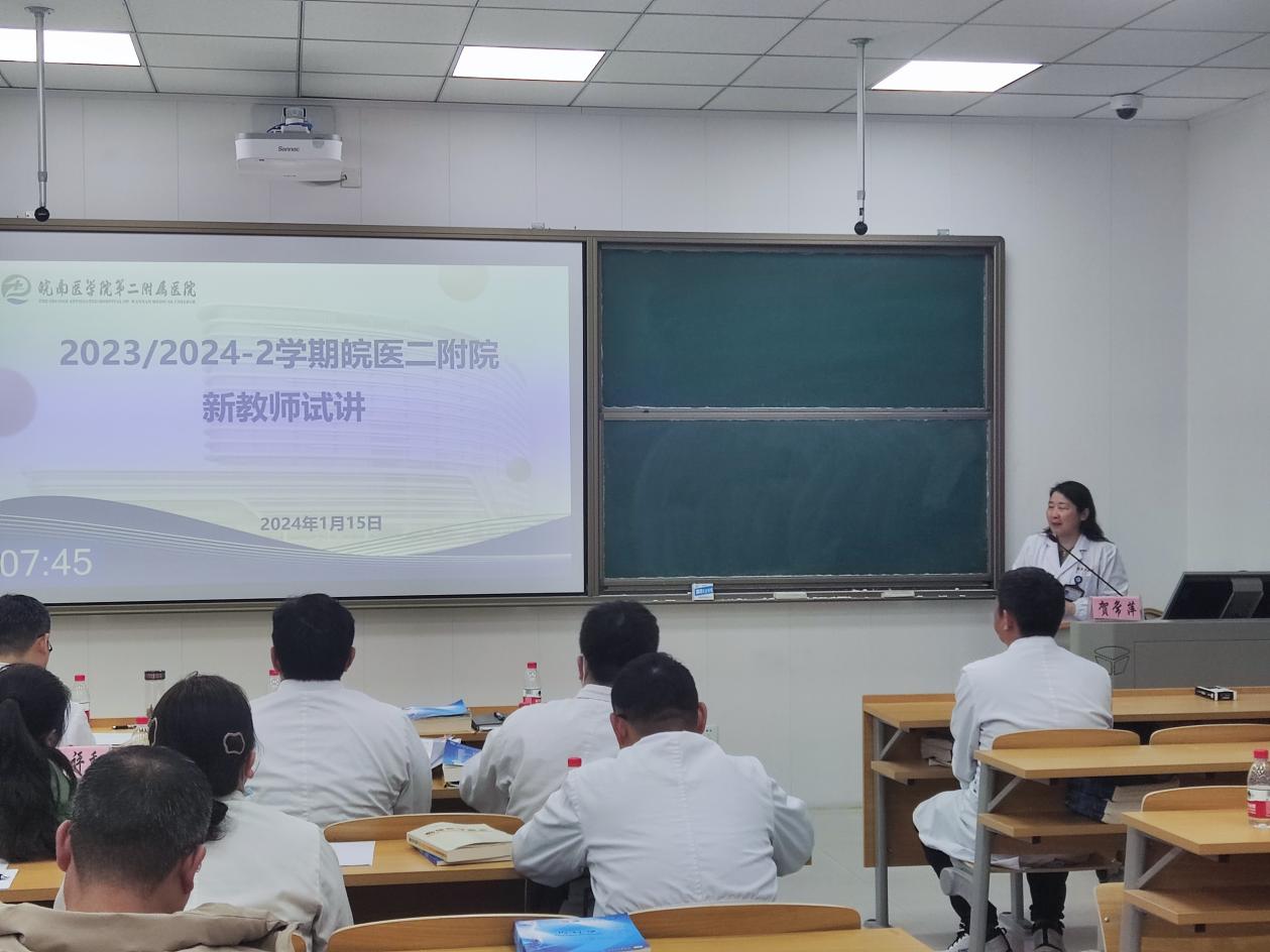 1月15日下午,威廉希尔第二附属医院教研室在5号楼四楼智慧教室(二),举行2023/2024-2学期新教师试讲,医院部分教学督导组专家、教研室主任共同担任评委。校教学督导组成员,医院教育处主任贺常萍主持会议,并担任评委组组长。