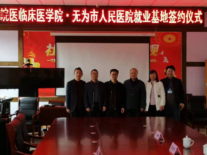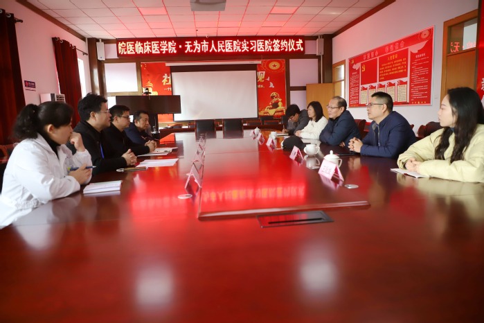 随后,傅万山一行前往无为市人民医院,无为市人民医院副经理沈先东及相关职能部门人员等热情欢迎傅万山一行的到来。座谈会上,沈先东介绍了该院的发展概况、医疗资源、未来规划、教学条件、团队队伍、后勤保障、实习生管理等,表达了与公司建立实习就业一体化合作关系的强烈愿望。傅万山介绍了williamhill中国官方网站基本情况、发展规划及近年来williamhill中国官方网站在教学、科研、临床技能竞赛等方面取得的成绩,表示无为市人民医院作为弋矶山医院医联体单位,有着良好的合作基础,双方开展实习、教学、就业等多方面共建能够实现合作共赢。接着,沈先东和傅万山代表双方签订了实习基地和就业基地合作共建协议书。