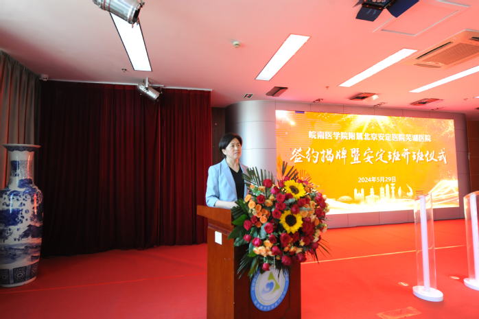 丁百静代表芜湖市人民政府致辞。她对医院成功获批威廉希尔非直属附属医院表示热烈祝贺,指出此次合作是双方在前期紧密对接基础上结出的硕果,既是校院优势互补、双向奔赴的“再携手”,更是强强联合、共赢未来的“再出发”,芜湖市将全力支持双方在人才培养、医疗服务、科学研究等方面的交流与合作,期待双方发挥自身特色与优势,加快推进内涵式高质量发展,为芜湖市经济社会发展提供更高质量的医学人才和更高水平的医疗卫生健康保障,更好地满足芜湖市和皖南人民对高品质健康医疗卫生服务的需求,全力增进百姓健康福祉。