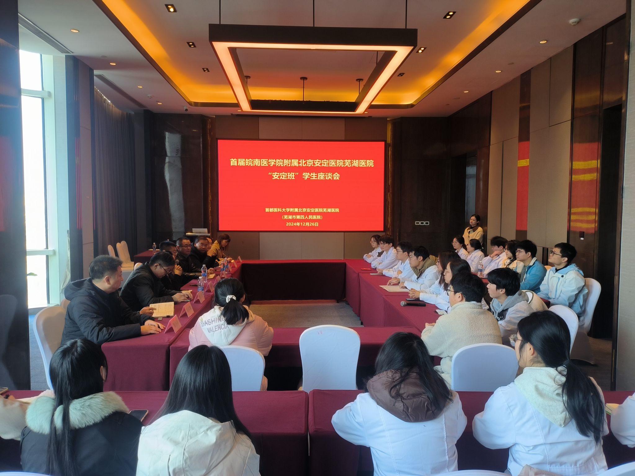 中午,公司联合芜湖市第四人民医院召开“安定班”师生座谈会。公司副经理文育锋,教务处、williamhill中国官方网站相关人员,芜湖市第四人民医公司党政领导,北京安定医院芜湖医院派驻院领导参加会议。会议邀请首都医科大学附属北京安定医院经理王刚为同学们答疑解惑。