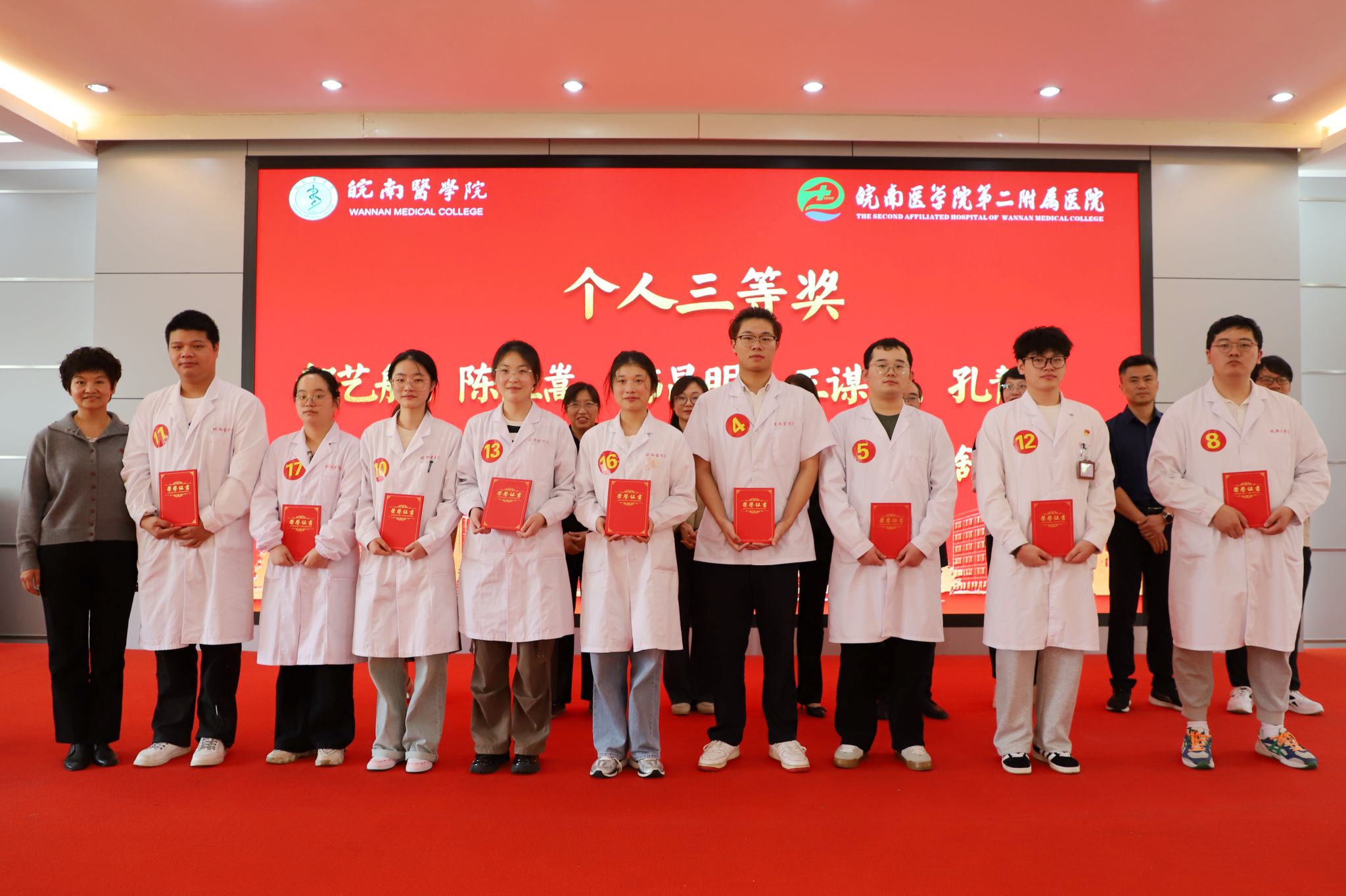 经过激烈角逐,最终王彬彬、魏心妍、王宇哲3位同学获得个人一等奖,熊智慧、唐盼等6位同学获得个人二等奖,郝艺航、陈恒嵩等9位同学获得个人三等奖;第二附属医院第一代表队获得团体一等奖,第二附属医院第二代表队获得团体二等奖,弋矶山第二代表队获得团体三等奖;张丽、王晖、杨光、邹波兰4位获评优秀指导教师,第二附属医院获优秀组织奖。
