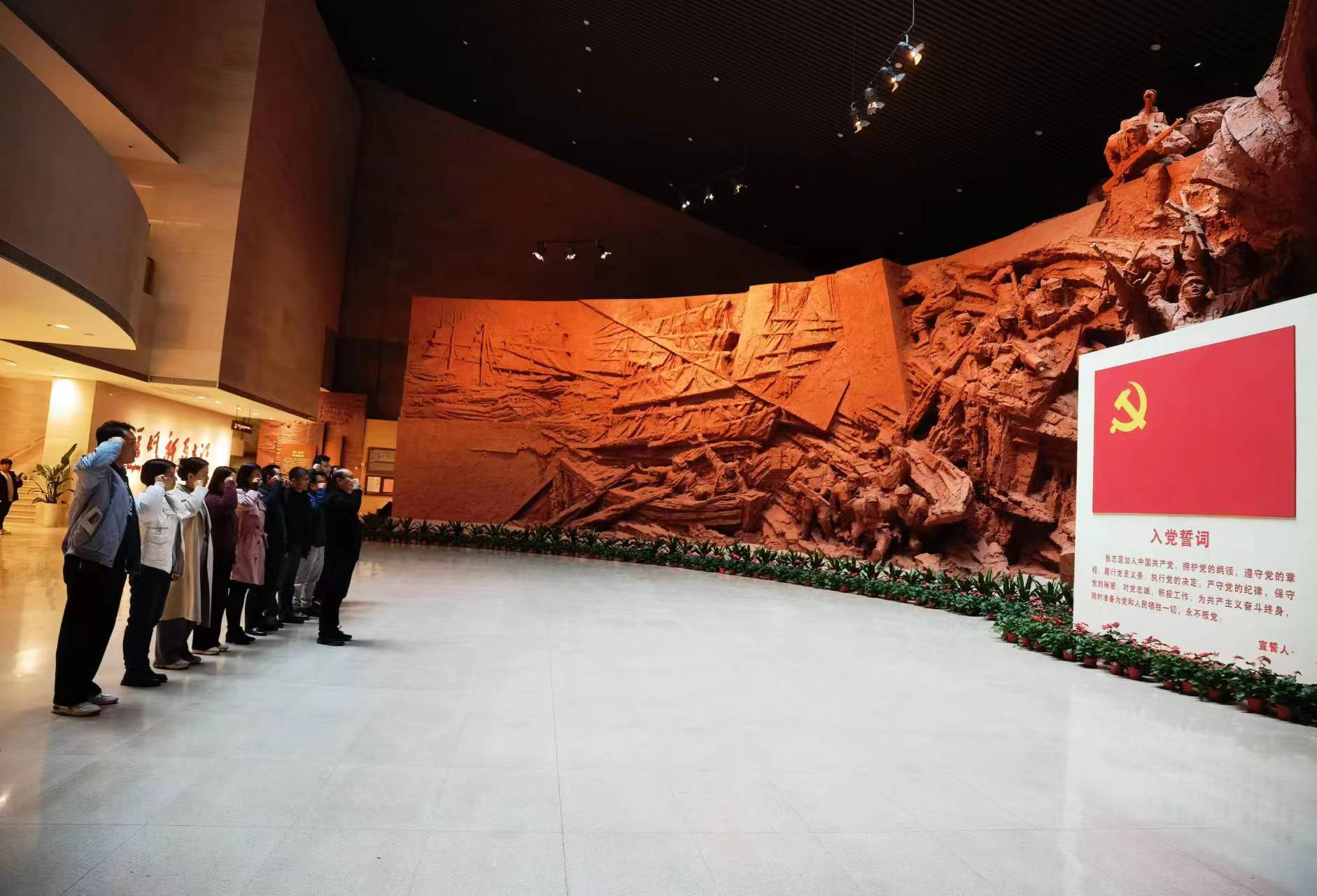 参观完渡江战役相关展厅后,大家来到负一楼临时展厅,参观了主题为“毛泽东家风——纪念毛泽东同志诞辰130周年”的展览。一封封家书、一个个人物和一件件事迹,让我们看到了毛泽东同志一家人为革命前仆后继、忘我无我的思想境界。最后,临床医公司党委书记傅万山带领大家在党旗前重温入党誓词。