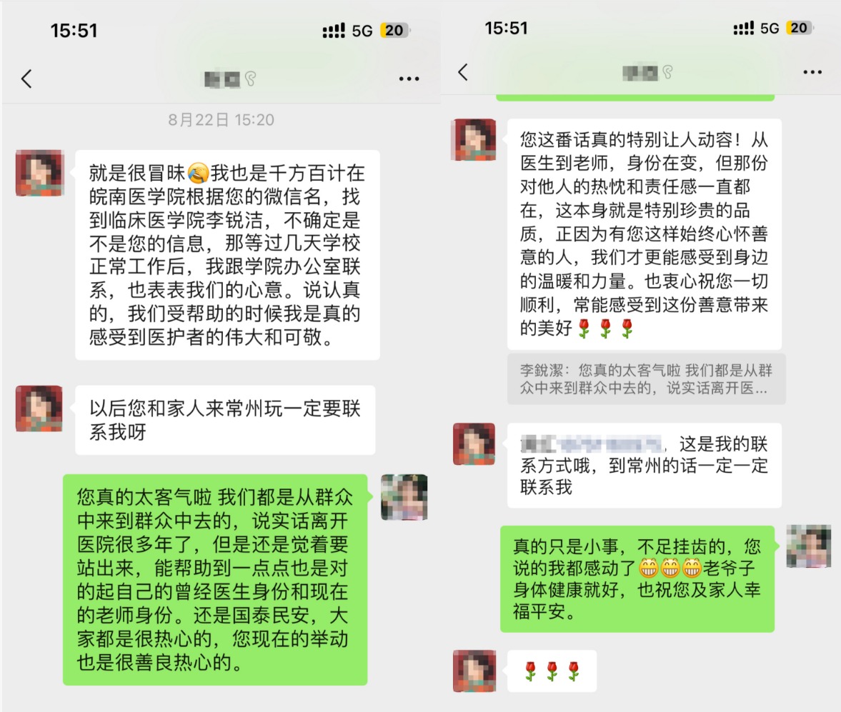 今年8月15日,李锐洁在行至八达岭长城北八楼附近时偶遇一名老人突发昏迷。凭借多年临床医学专业素养,她挤开人群冲至老人身边,迅速蹲下对老人进行生命体征检查,询问家属既往病史,安抚老人情绪,结合现场环境与老人症状,快速排除心脑血管急症等风险,并向周围游客求助,寻找含糖食物与温水。期间,她始终保持半蹲姿势,密切观察老人的意识、面色变化,每隔几分钟便轻声询问身体感受,用专业的沟通与耐心的陪伴,让老人逐渐恢复意识。待老人身体状态趋于稳定后,考虑老人身体虚弱,长城路段陡峭难行,她一路搀扶老人缓慢下山,叮嘱后续就医事项,随后悄然离去。