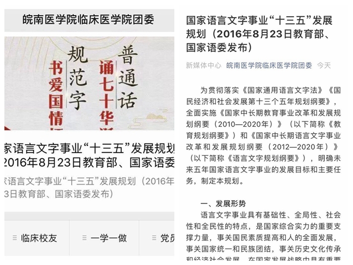 公司团委积极开拓“互联网+普通话宣传”新形式,通过QQ、微信公众号、微博、抖音等线上网络平台,宣传推送国家和省语言文字相关法律法规、方针政策和规范标准,并对线下活动进行大力宣传。