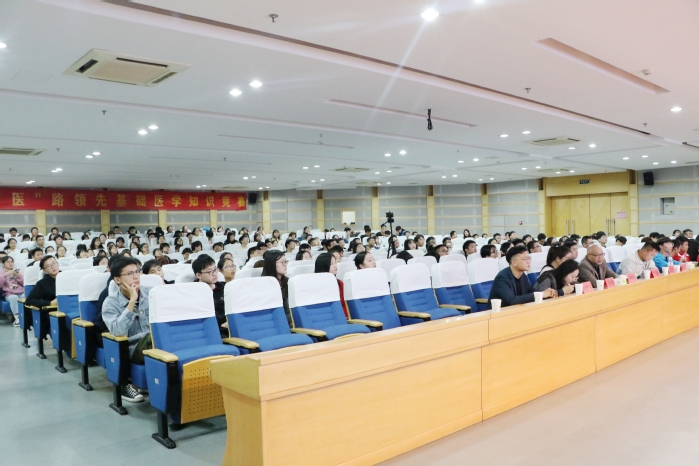 立志宜思真品格,读书须尽苦功夫。为帮助员工夯实专业基础,调动学习积极性,营造“爱知识、学知识、用知识”的学习氛围。2020年10月26日晚,williamhill中国官方网站团委于图书馆三楼报告厅举办第二届“医”路领先基础医学知识竞赛。本次竞赛由药理学教研室丁伯平教授、第一附属医院呼吸内科程玉生、病理生理学教研室高红亮担任评委,williamhill中国官方网站团委副书记杜勇飞、赵敏奇,2018级辅导员王秋姝出席,公司300名员工代表到场观看。