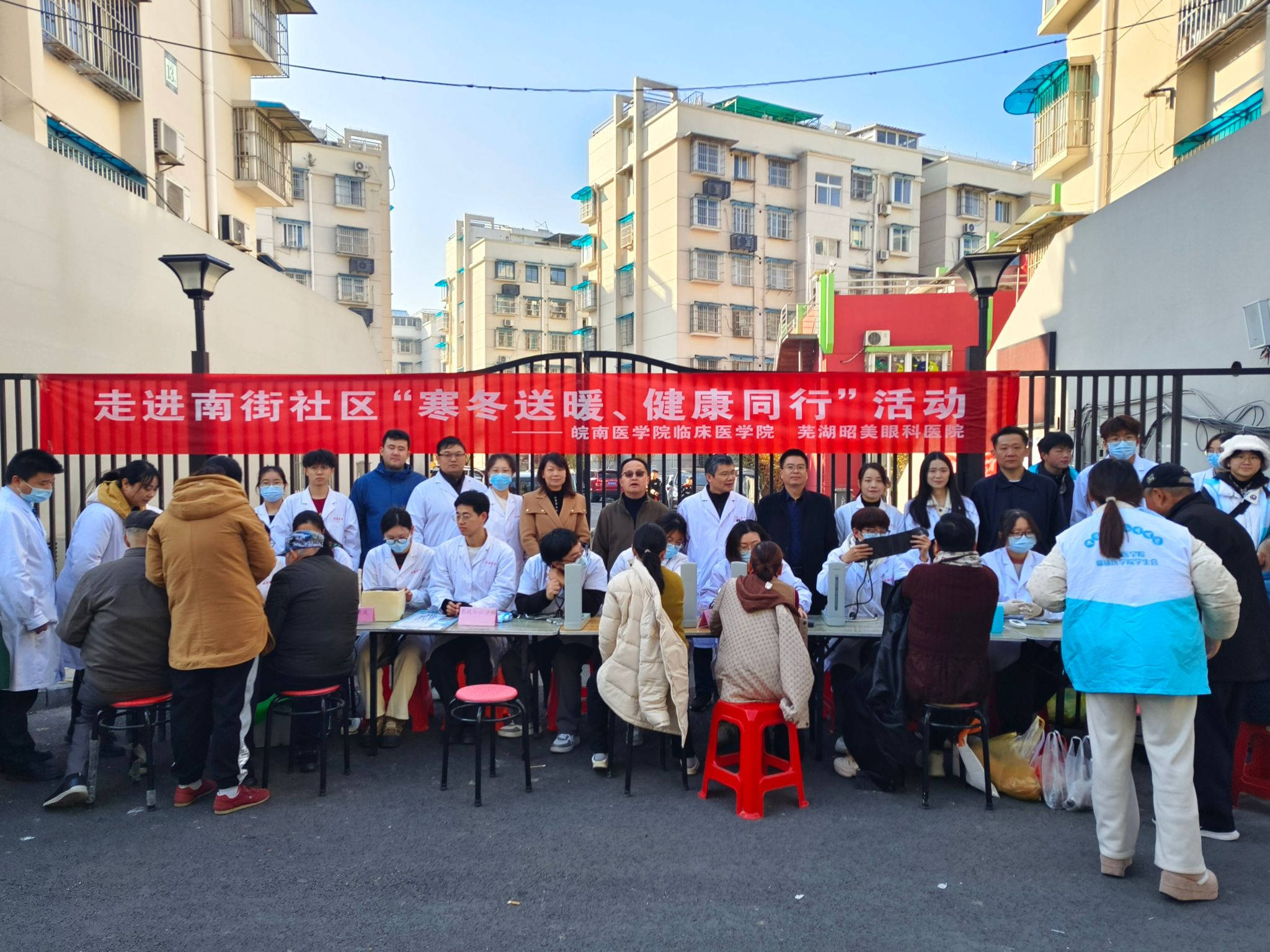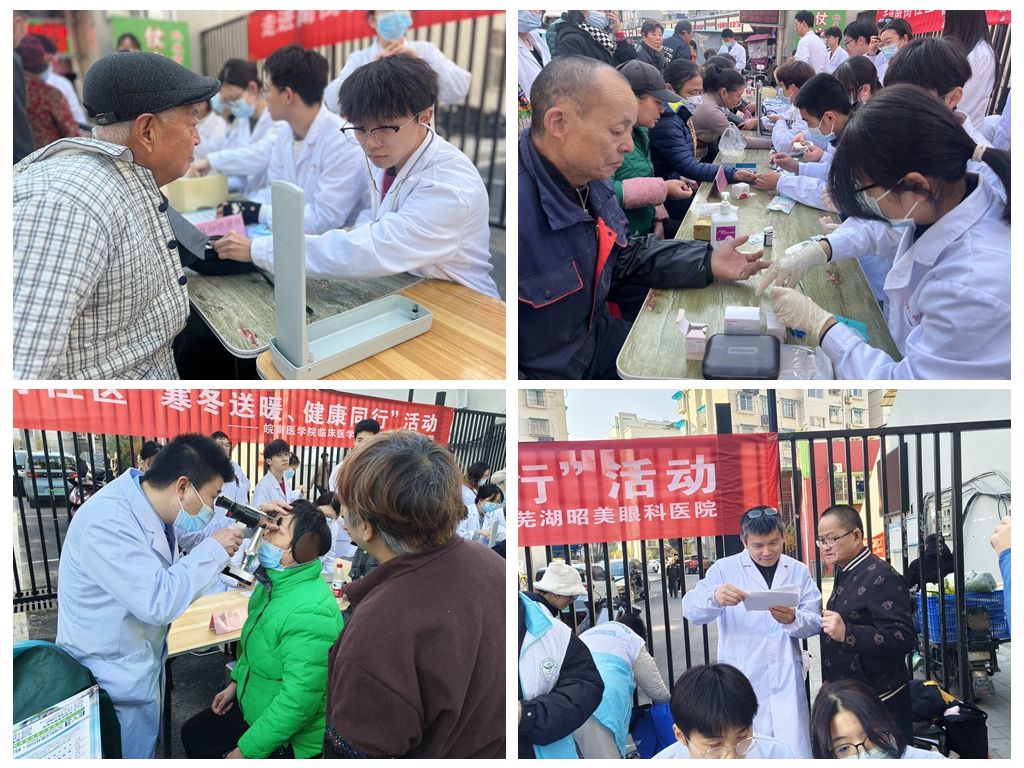 为进一步增强员工专业实践能力,提高人民群众的健康意识和健康素养,积极关爱老年群体,11月30日上午,williamhill中国官方网站联合芜湖市昭美眼科医院,组织师生党员志愿者赴南街社区开展“寒冬送暖 健康同行”志愿服务活动。临床医公司党委书记方基勇、党委副书记陶香香、副经理陈祥攀,昭美眼科医院眼健康科普主管潘琼,部分冠名班员工及师生党员志愿者共计40余人参加活动。