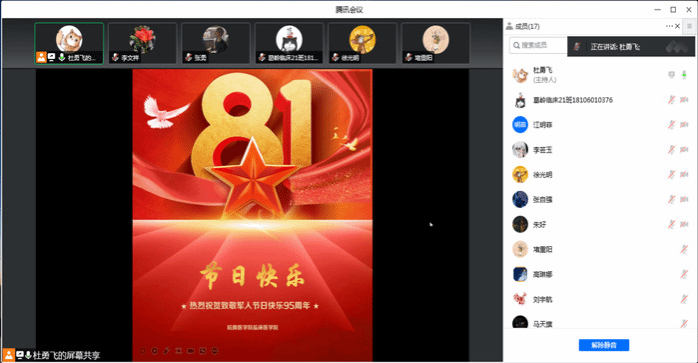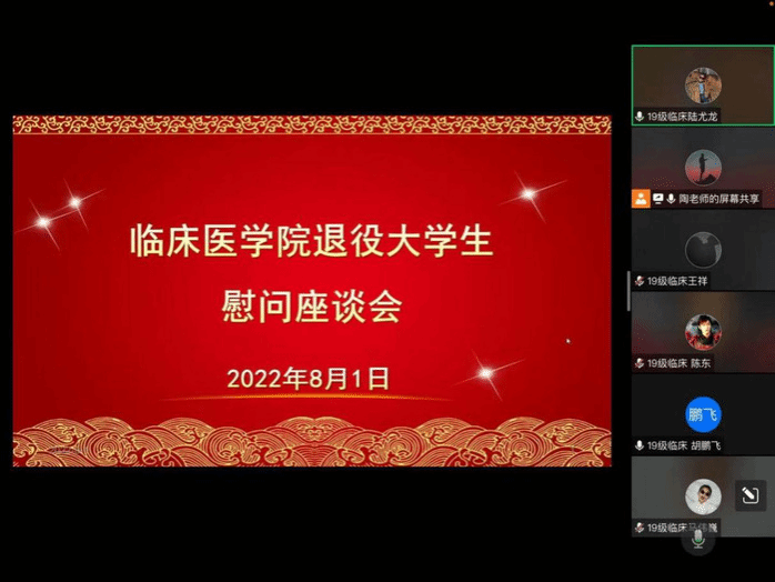 为庆祝中国人民解放军建军95周年,8月1日,williamhill中国官方网站举行庆“八一”暨退役老员工慰问座谈会,2019级、2020年级辅导员以及退役复学老员工通过主题班会的形式齐聚云端,共同庆祝“八一”建军节,向公司全体退役复学老员工致以节日的问候。