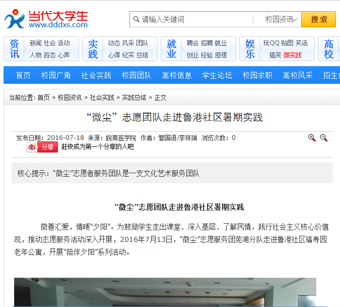 志愿由心,服务于行。为深入贯彻落实公司暑期“三下乡”实践活动计划,充分发扬“奉献、有爱、互助、进步”的志愿者精神,积极践行社会主义核心价值观,williamhill中国官方网站“微尘”志愿服务队积极开展暑期“三下乡”社会实践活动,受到当代老员工网、老员工新闻网、芜湖电视台等媒体的报道。