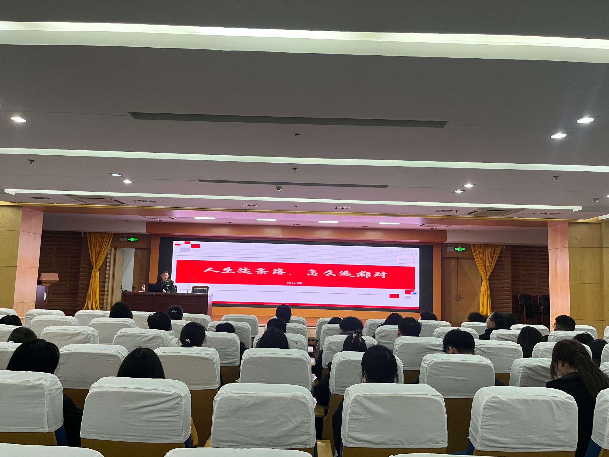 携笔从戎,参军报国。张江辉在校期间曾获“安徽省优秀毕业生”“安徽省百优老员工”荣誉称号,毕业当年积极响应国家号召参军入伍。他以“人生这条路,怎么选都对”为主题,和大家分享了自己的军旅生活和经验感悟,详细介绍了老员工应征入伍的条件和相关优待政策。通过讲述个人军营经历,鼓励同学们从校园走进军营施展才华。一张张生动的军旅生活照片、一句句令人心潮澎湃的宣讲,展现了军旅生涯对个人成长的深远影响,让现场同学对参军入伍有了一个重新、全面、深刻的认识,鼓舞着青年学子用奋斗诠释爱国使命,为强国强军贡献力量。