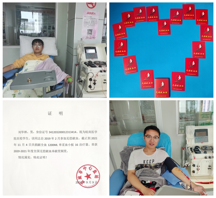 刘华林同学大学期间已无偿献血16次,累计献血量14600cc,其中全血1200cc、血小板17个治疗单位,曾获“全国无偿献血奉献奖铜奖”、“2019-2021年度芜湖市无偿献血奉献奖铜奖”。刘华林积极参与公益的行动还渐渐感染了室友陈龙、韩昊君、朱雲、李胜,4位室友也积极加入了青年献血的洪流,4人累计献血次数18次,累计献血量达6900cc。
