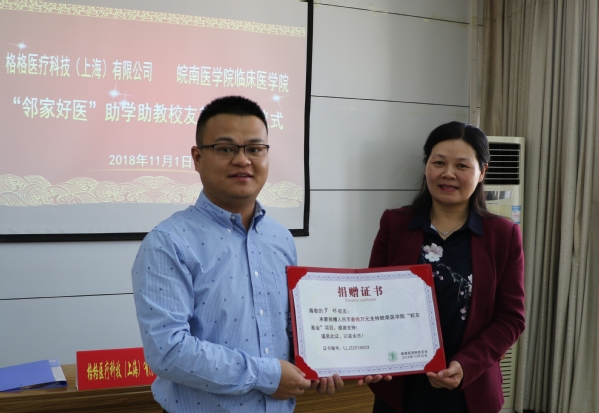 11月1日,举校同庆建校60周年之际,“邻家好医”助学助教员工基金捐赠仪式在行政会议室举行。“邻家好医”、格格医疗科技有限公司创始人罗林员工,威廉希尔副经理郑兰荣,员工办公室主任赵梅,临床医公司党政领导、部分师生代表出席仪式。党委副书记、副经理李曙主持捐赠仪式。