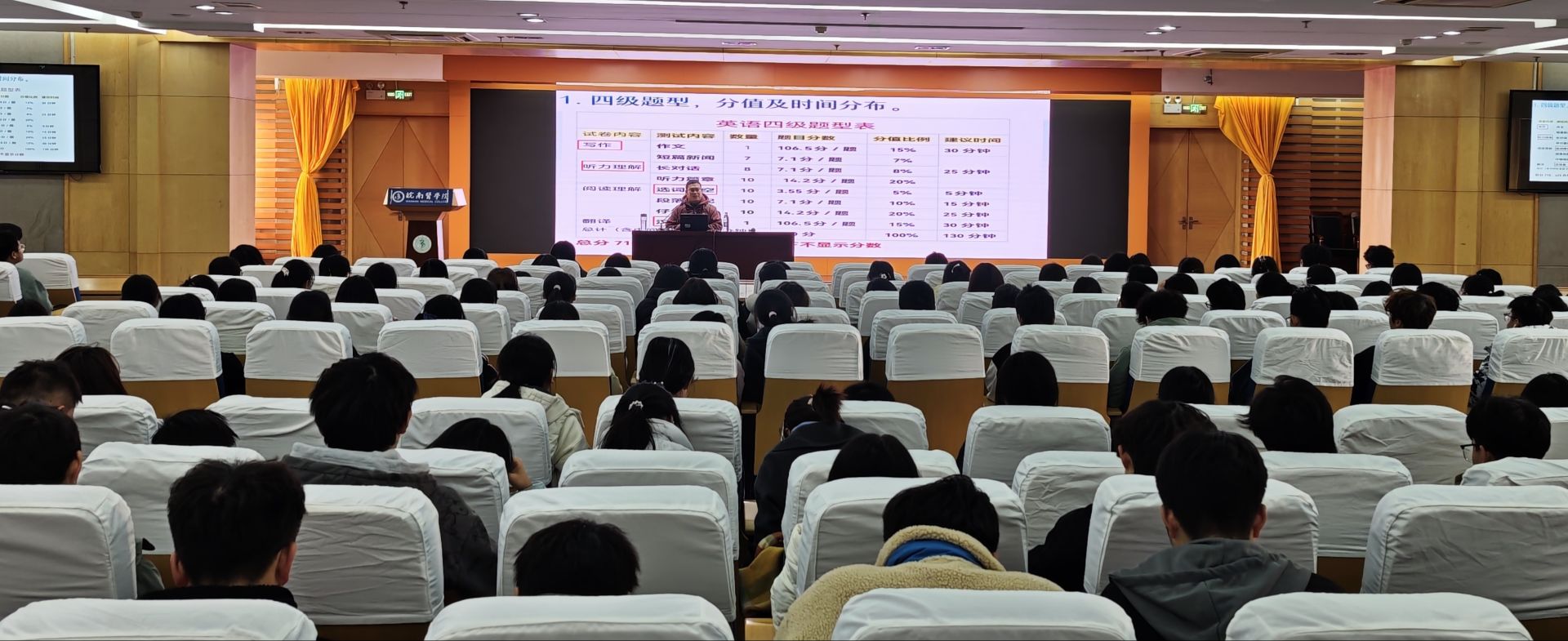 为帮助员工掌握高效备考方法,提升应试能力与英语综合水平,更好地备战大学英语四级考试,williamhill中国官方网站2025级邀请英语专业教师和全国老员工外语能力大赛演讲比赛获奖者在图书馆三楼学术报告厅举办英语学习专题辅导。