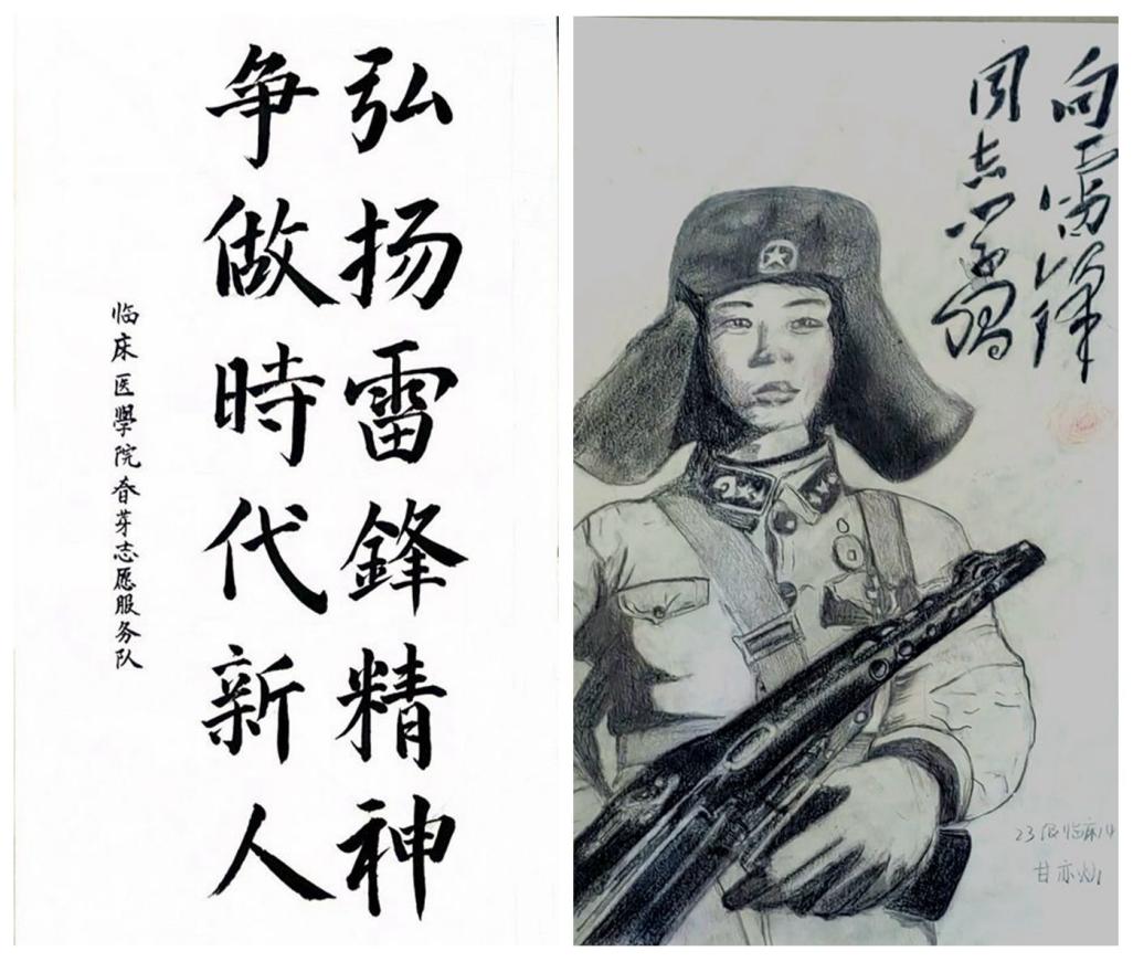 水墨丹青,书画传情。近期,春芽志愿服务队开展“弘扬雷锋精神,争做时代新人”书画宣传活动。同学们以书画为载体,诠释雷锋精神,书写雷锋精神,讲好雷锋故事,号召广大学子将雷锋精神与自身专业相结合,争做雷锋精神的传播者、践行者。