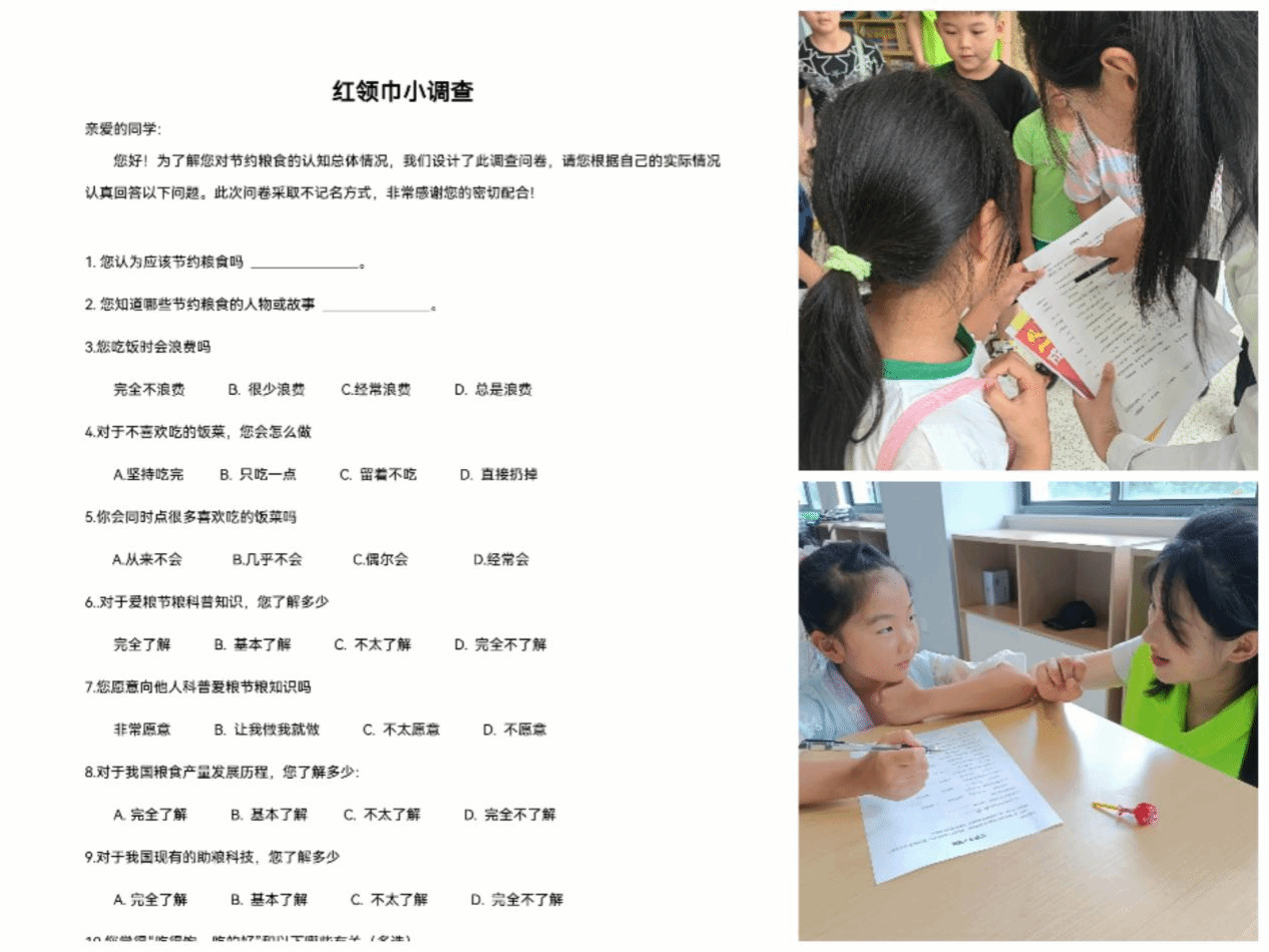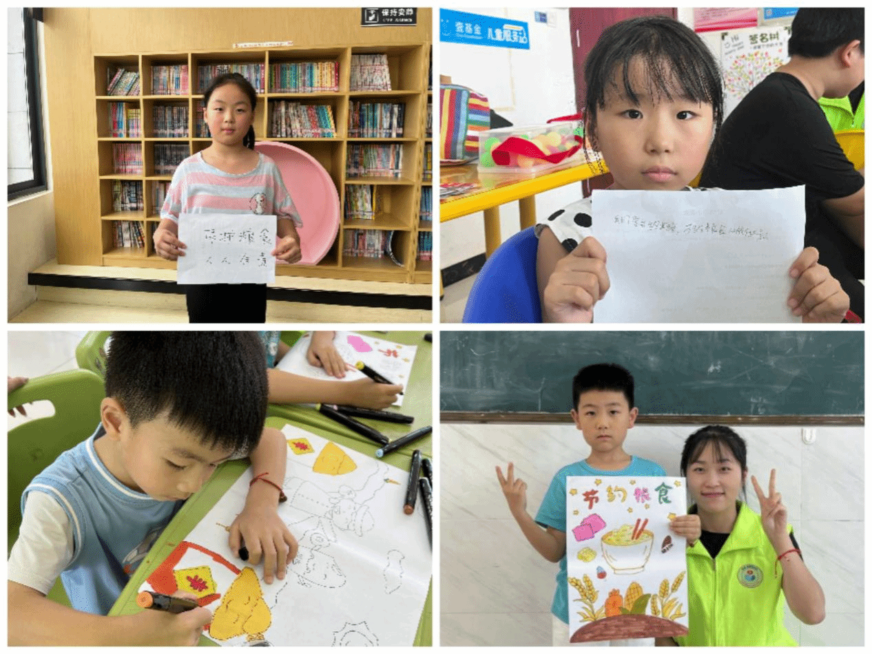 7月26日至8月12日,志愿者们来到蚌埠市沈圩儿童驿站、芜湖市江湾书院和熔炉书苑等地,在深入调研少先队员们食品浪费情况后,利用自制课件,向小朋友们普及介绍粮食安全有关知识。志愿者们以《金色的鱼钩》入手,详细介绍了勤俭节约对维护粮食安全的重大意义,生动地讲述了一个个杰出人物的节俭小故事,并普及了浪费粮食的严重后果。除课件宣讲外,志愿者们还丰富课堂形式,开展绘画、手工等实践课,利用原创漫画《成群“节”队跟党走》、原创科普手册、原创IP“穗穗”和“依依”等,激发少先队员维护粮食安全的积极性与主动性。