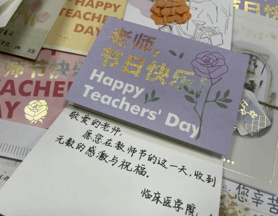 同学们制作了精美的贺卡,一张张贺卡在方寸之间写下了他们对老师的敬意和感谢。同时,9月10日上午,同学们前往课堂、临床医学实验实训中心等地,在课间休息时为老师们送上了一盆盆绿植、盆栽,寓意着生命的延续和医学事业的繁荣。