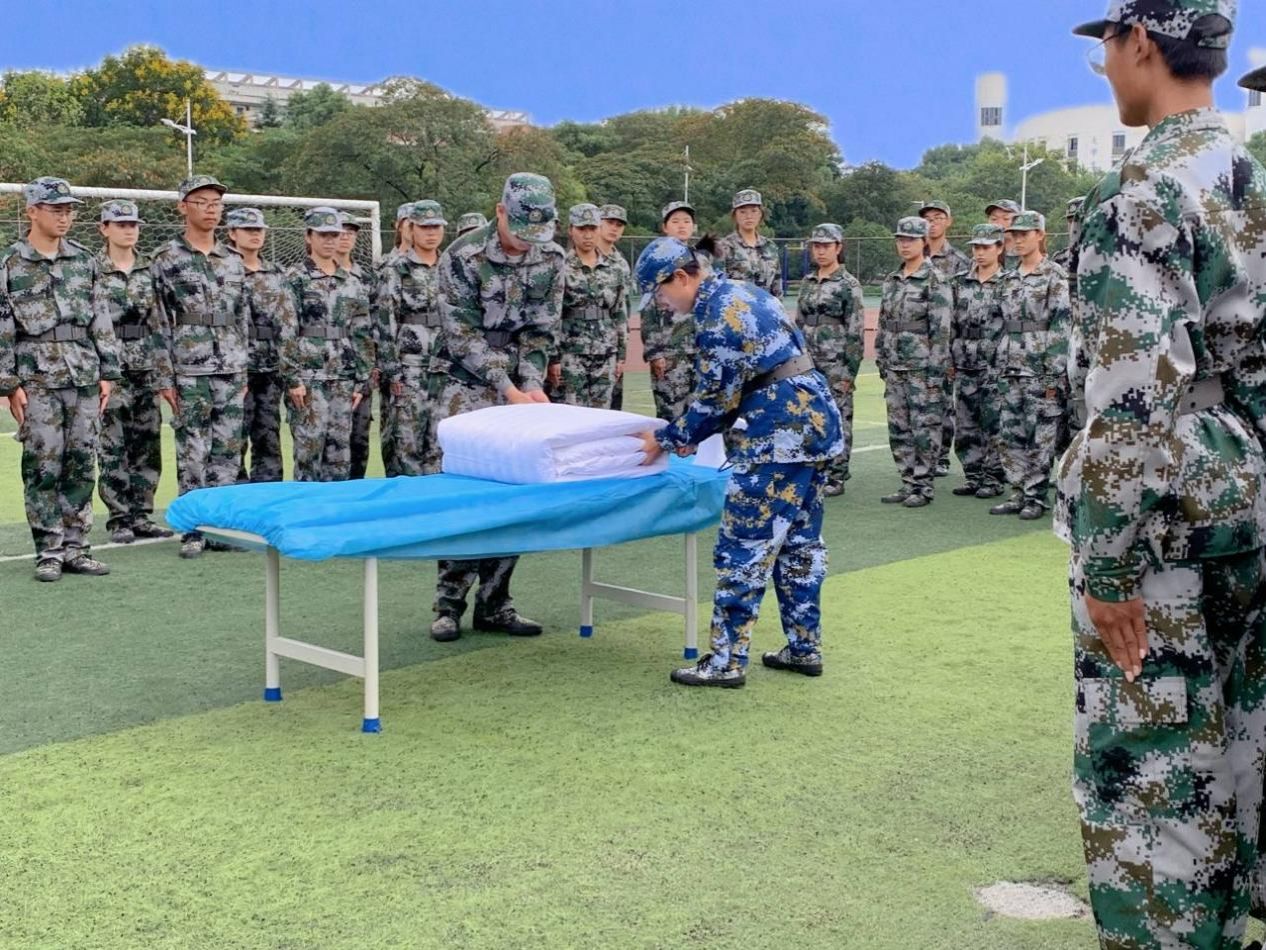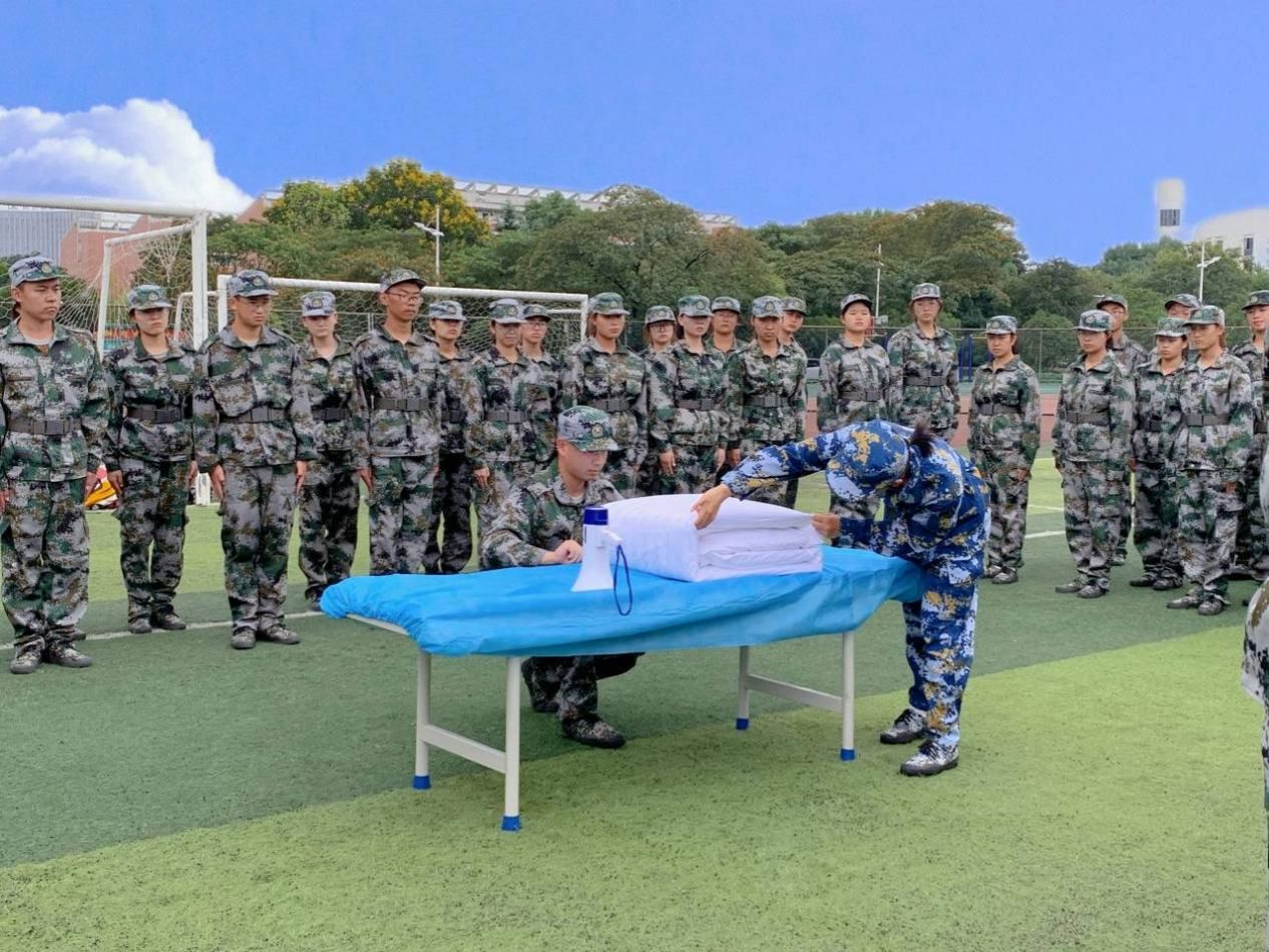 活动现场,教官们以身作则,现场做示范,手把手教学,演示了叠被子和物品摆放的技巧,一床蓬松的被子在各位教官简单的“叠、压、折、挤、捋”几个动作下,变成了有棱有角的“豆腐块”,同学们看到自己“面包式”被子的魔力变身,无一不感到惊叹、敬佩。