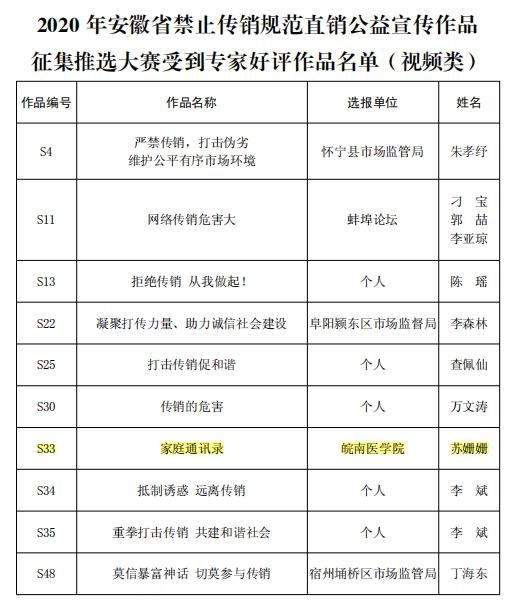 12月7日,由安徽省市场监管局、安徽省文明办、安徽省教育厅和安徽省广电局联合发起举办的2020年安徽省禁止传销公益宣传作品征集推选大赛评选结束,2017级员工苏姗姗的作品《家庭通讯录》荣获专家好评作品奖(视频类),这是公司在此比赛中的唯一获奖作品。