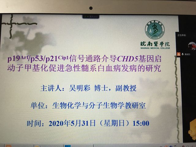 为普及基础医学专业知识,拓展临床学子思维,提升公司员工科研思考能力,丰富疫情期间员工课余生活,5月31日15时,williamhill中国官方网站邀请吴明彩博士在线上作题为“p19Arf/p53/p21Cip1信号通路介导CHD5基因启动子甲基化促进急性髓系白血病发病的研究”的讲座。williamhill中国官方网站各个年级“大创项目”主持人以及在实验室学习的同学们参加了此次讲座。