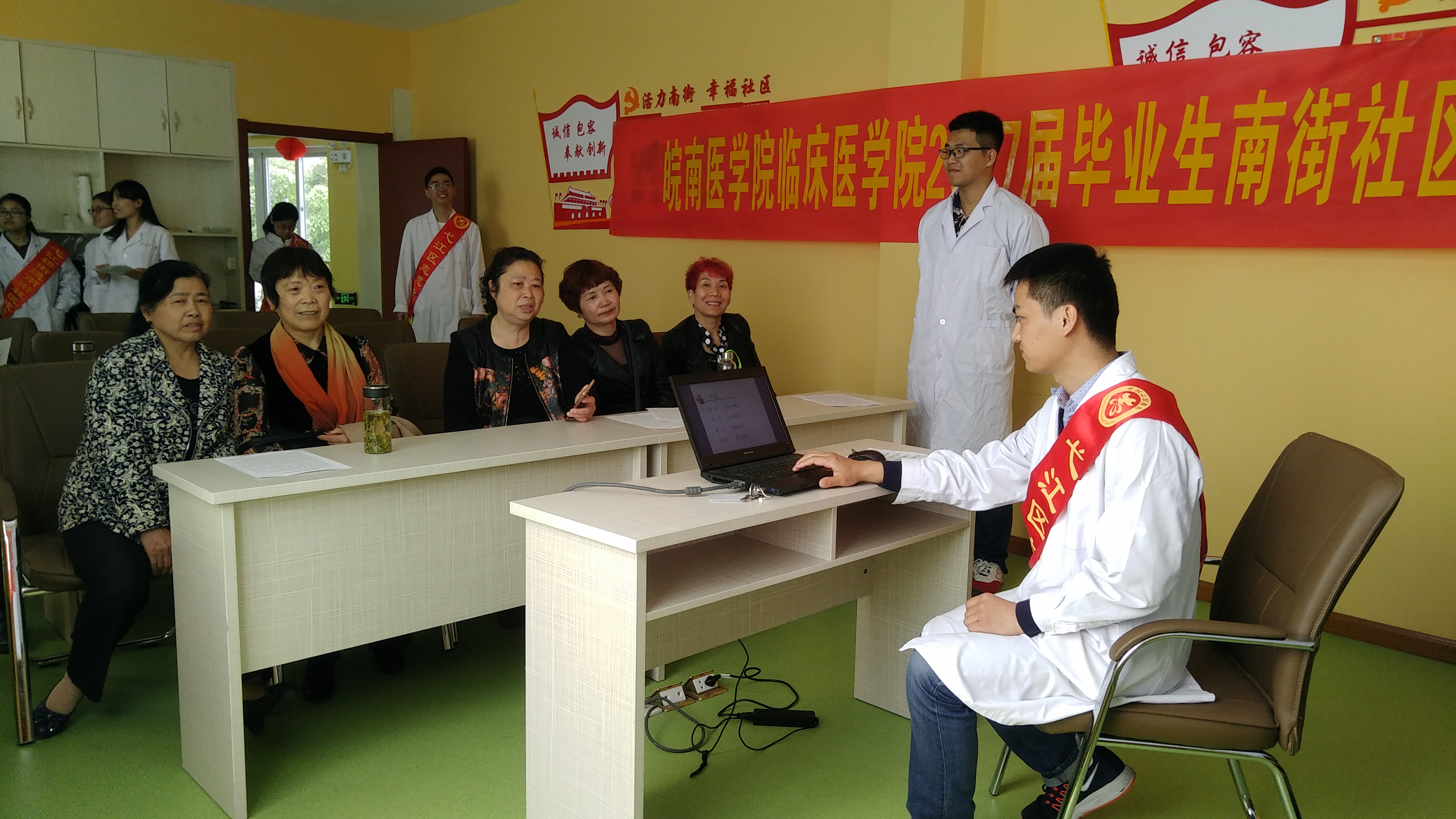 听闻志愿服务者们的到来,南街社区上百名居民陆续赶到,现场气氛活跃。义诊活动分为2个活动区域同时进行——健康检测区和健康常识科普区。在健康检测区,志愿者们认真地为居民检测血压,耐心细致地为居民们解答疑惑。在健康常识科普区,志愿者们通过PPT讲解现场初级急救知识,使居民们了解和初步掌握在日常生活中遇到危险时的紧急自救和他救方法。通过散发一百多份健康宣传手册来普及初夏传染病毒预防与防治相关健康知识,让居民们在春末夏初时节了解良好的卫生习惯来预防传染病。毕业生党员们生动有趣的讲解、熟练专业的操作,获得了在场居民们的一致赞誉。