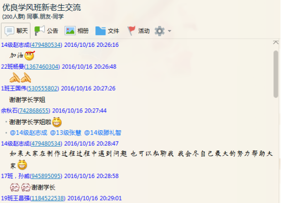 为了更好的开展创建工作,10月中旬,2013、2014、2015级同学利用网络平台召开“优良学风班”评选经验交流会。2015年成功获评“校十佳优良学风班”的班委干部,围绕申报过程为初次参与申报工作的2015级员工答疑解惑,毫无保留地传授了材料准备和现场汇报各环节的宝贵经验。
