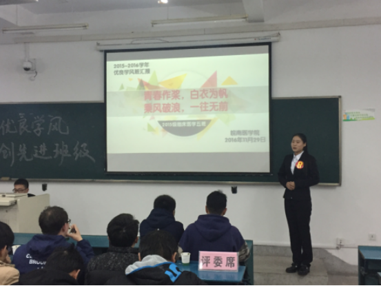 11月29日下午,在公司“优良学风班”第一轮评选中,2014、2015级以精彩的汇报展示了团结友爱、奋发向上的良好学风班风,赢得了现场评委和观众的阵阵掌声,最终临床医学专业2014级5班、6班和2015级5班、11班、22班等五个班成功进入第二轮评选,成绩喜人。