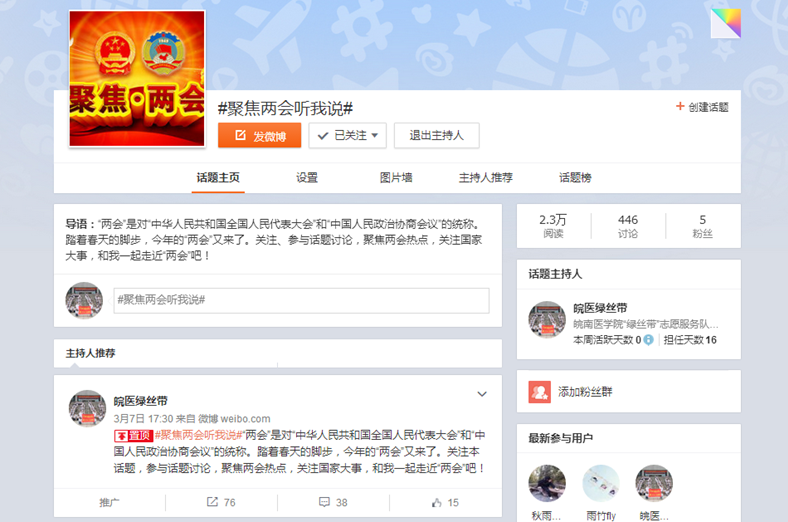 2016年是“十三五”规划的开局之年,也是全面建成小康社会决胜阶段的开局之年。在今年的全国两会上,备受瞩目的“十三五”规划无疑成为了重头戏之一。为了进一步学习以习近平同志为核心的党中央治国理政新理念新思想新战略,年级党支部在新浪微博发起了“聚焦两会听我说”话题讨论,号召广大网友分享两会热点,关注时事民生。在该话题下方,五大发展理念、教育改革、医疗改革、养老改革、创业就业等等,都是同学们热议的焦点。截至发稿时,该话题共有446条相关讨论,累计阅读量突破2.3万次。