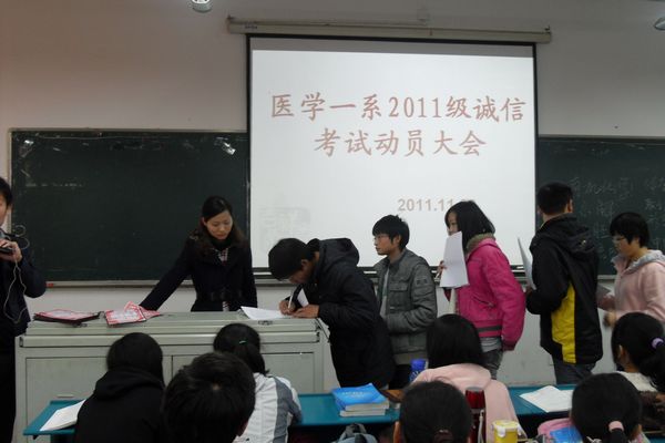 临近期末,医学一系2011级新生也面临大学以来的第一次期末考试,为进一步加强学风、考风建设,倡导诚信做人、诚信考试,医学一系2011级于11月30日中午在西教202教室举行“医学一系2011级诚信考试动员大会”, 辅导员刘韦、王平、叶长江和2011级全体班干参加会议。