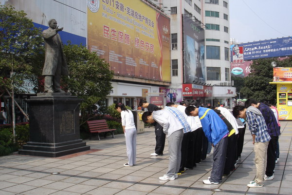 历史是一面镜子,也是一部教科书。从1911年秋天武昌城头震惊世界的一声枪响,到今天中国大地日新月异的现代化图景,辛亥革命以来的百年巨变,蕴含丰富历史启示,具有深刻现实意义,标明了走向未来的前进方向。 2011年10月10日,恰逢辛亥革命100周年纪念日,医学一系2011级新同学们组织开展一系列活动纪念辛亥革命100周年。10月9日,纪念辛亥革命100周年大会在北京人民大会堂隆重举行,中共中央总书记、国家主席、中央军委主席胡锦涛在大会上发表重要讲话。同学们通过网络等媒体收看了本次大会,了解了辛亥革命在民族复兴进程中的重大意义,深情展望中华民族伟大复兴的光明前景;10月10日上午,同学们又来到位于中山路步行街的孙中山先生铜像前,深切缅怀孙中山先生等辛亥革命先驱的历史功勋,表达对于革命先辈的崇敬之情。同学们纷纷表示要学习和弘扬他们为振兴中华而矢志不渝的崇高精神,要学得一身本领为实现中华民族伟大复兴贡献自己的一份力量。