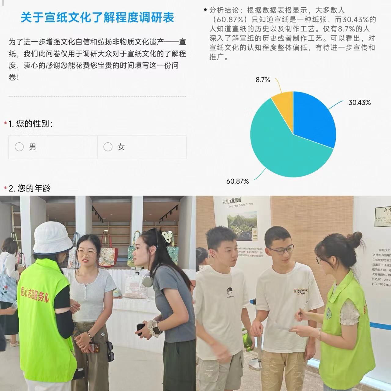 问卷寻梦,纸绘匠心。为了更广泛地了解宣纸在群众中的认知度与影响力,团队成员通过发放问卷、现场采访等形式,开展了一场别开生面的宣纸文化调研活动。调研结果显示,虽然宣纸之名广为人知,但对其历史、制作工艺以及文化价值深入了解的人并不多,大众对宣纸文化的认知程度整体偏低。这一发现更加坚定了团队成员推广宣纸文化、提升公众文化自信的决心。